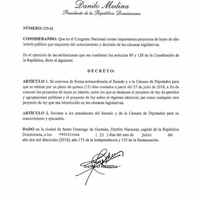 SANTO DOMINGO.- El presidente de la República, Danilo Medina, convocó de forma extraordinaria al Senado y la Cámara de Diputados para que se reúnen por un plazo de 15 días, contados a partir del 27 del presente mes, a fin de conocer proyectos de leyes en trámite.