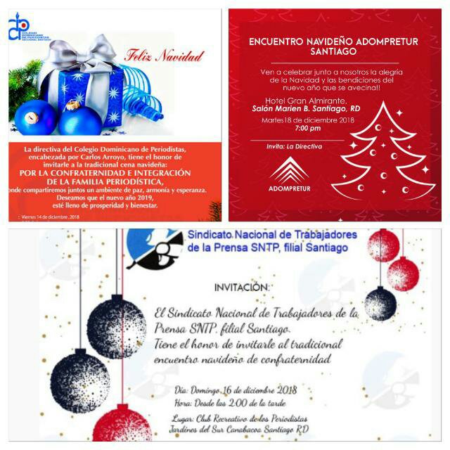 Invitada por Colegio Dominicano de Periodistas (CDP) a su fiesta navideña a un compartir sano entendemos sera una velada entre compañeros y compañeros de Santiago. Nos prometen ratos divertidos música, rifas, regalos y abrazos. La cita es hoy viernes 14 de diciembre a partir de las 8:00 pm en el Club Recreativo de Periodistas.