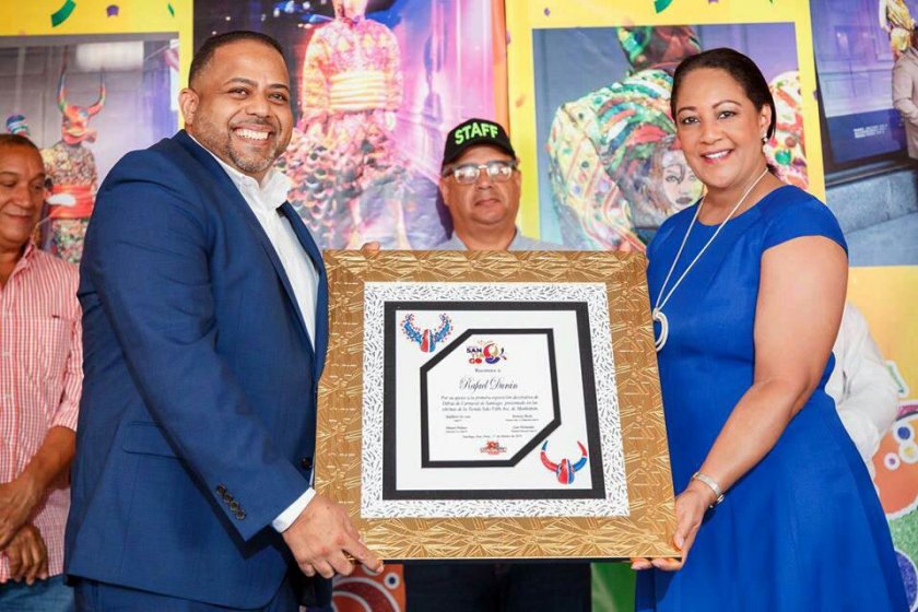 SANTIAGO. La Corporación del Carnaval de Santiago reconoció al santiaguero Raylin Díaz Suárez, director de Modas de Saks Fifth Ave por la iniciativa y valoración al carnaval de Santiago, con la exhibición en las vitrinas de la prestigiosa tienda, de diversas piezas de su colección de primavera, junto a creaciones y accesorios del popular personaje de lechón símbolo principal del carnaval local.