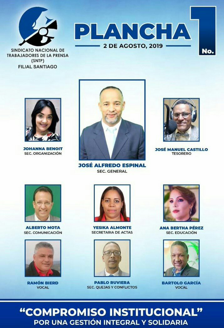 El periodista José Alfredo Espinal, candidato a la Secretaría General, estará acompañado por la periodista Johanna Benoit, en la Secretaría de Organización, el locutor y reportero gráfico José Manuel Castillo, en la Secretaría de Organización, la periodista Ana Bertha Pérez, en la Secretaría de Educación y el expresidente de la Asociación de Locutores de Santiago, Alberto Mota, en la Secretaría de Comunicación.