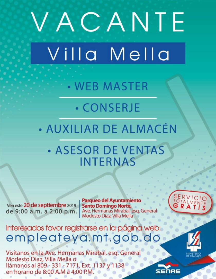 Santo Domingo. -El Ministerio de Trabajo, a través del Servicio Nacional de Empleo (SENAE), invita a todas las personas interesadas a participar en la jornada de empleo que se realizará este viernes 20 de septiembre, en horarios de 9:00 a.m. a 2:00 p.m., en el parqueo del Ayuntamiento de Santo Domingo Norte, Villa Mella, para empresa en el área de servicios.