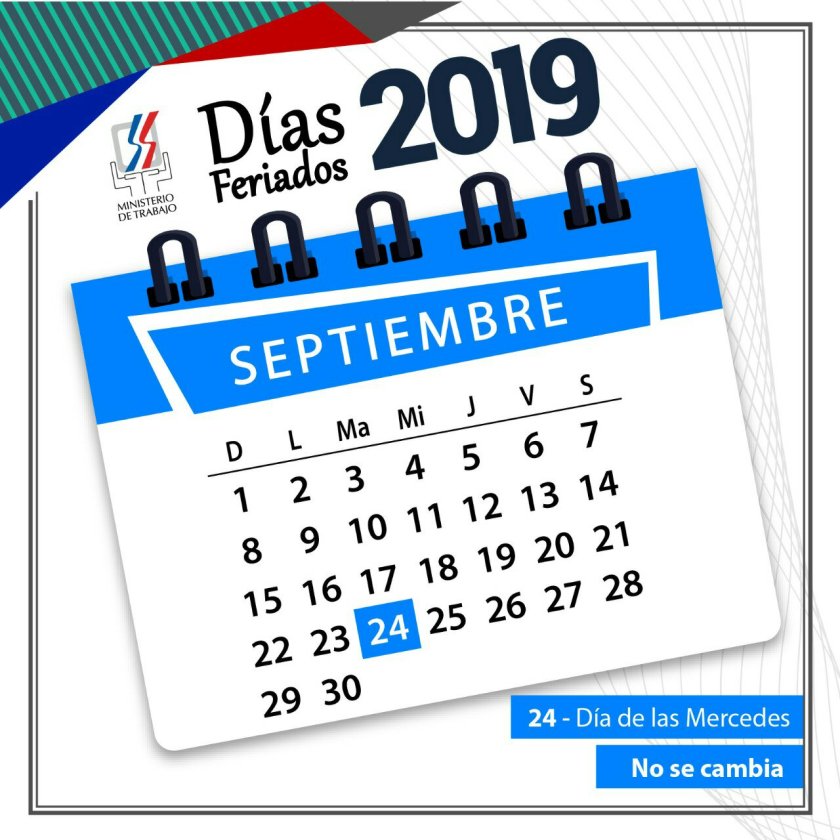 Santo Domingo. -El Ministerio de Trabajo reitera a toda la colectividad empresarial y trabajadora del país, que la festividad religiosa “Día de las Mercedes”, que se celebra este martes 24 de septiembre, no se cambia.