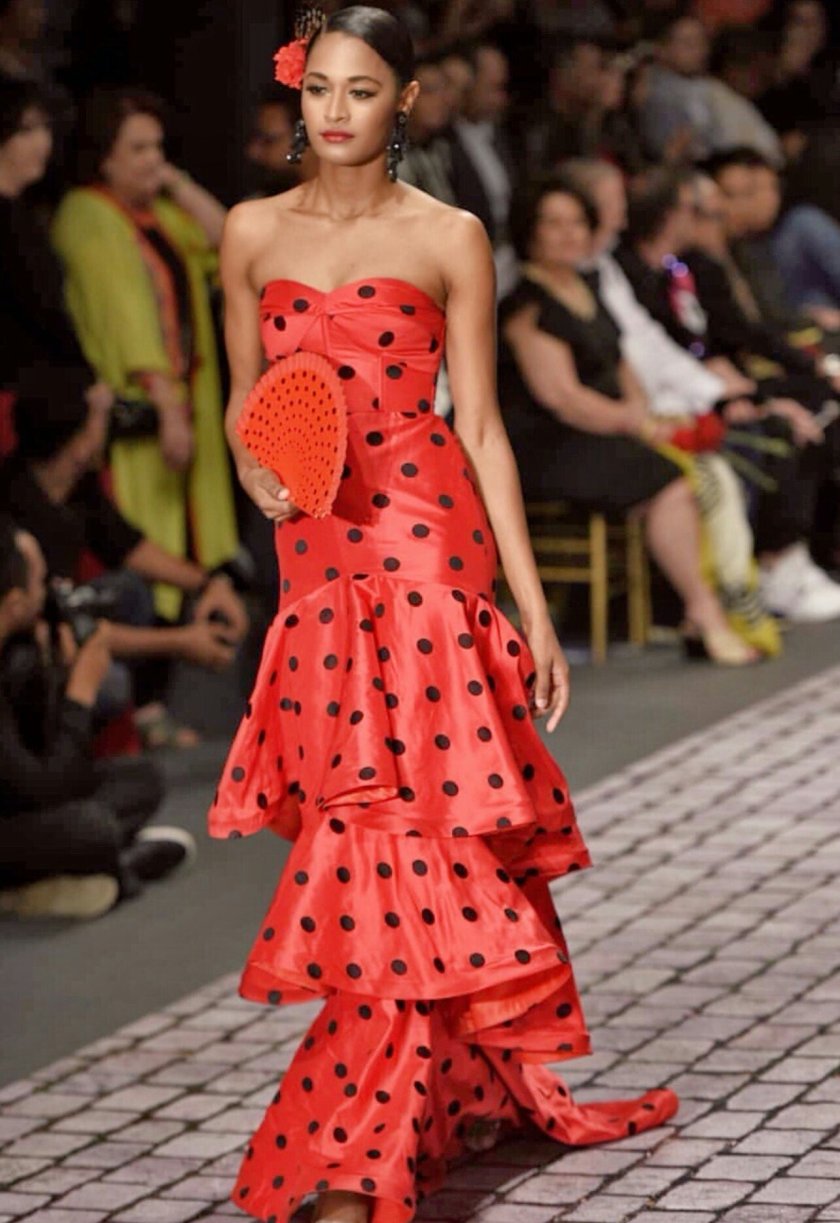 Su principal inspiración fue el flamenco y las corridas de toros, donde se refleja una España completa con aires de modernidad y cortes más contemporáneos, sin dejar de lado los volantes y lunares tan distintivos de sus vestimentas.