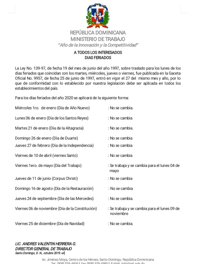 Santo Domingo.- El Ministerio de Trabajo anuncia a empleadores, trabajadores y a la población empresarial en sentido general, las fechas en que serán celebrados los días feriados durante el año 2020, dando cumplimiento a la Ley 139-97, la cual establece el traslado de los días feriados.