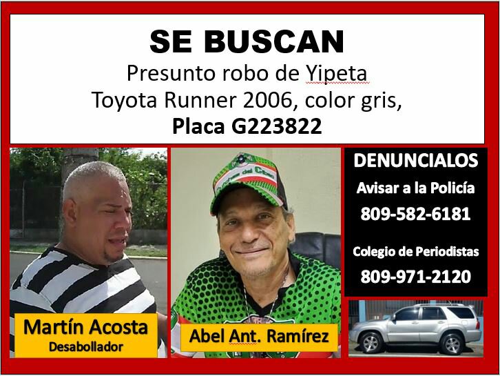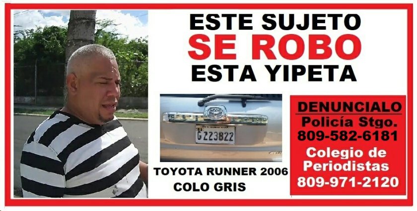La Seccional Santiago del CDP y el periodista Perfecto Martínez denunciaron de manera conjunta el robo sospechoso del vehículo Toyota Runner modelo 2006, propiedad del comunicador y escritor santiagués, hecho ocurrido en el taller “Clutches del Cibao”, ubicado en la avenida Circunvalación #35 frente al cementerio del Ingenio.