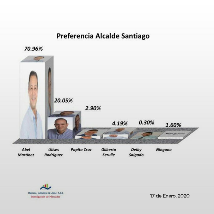 Cuando a los entrevistados se les preguntó, quien cree que ganará las próximas elecciones como alcalde del Municipio de Santiago, el 72.26%, dijo que Abel Martínez, el 19.36 % se inclina por Ulises Rodríguez, un 3.89% cree que será Gilberto Serulle y el 2.82% favorece a Papito Cruz.