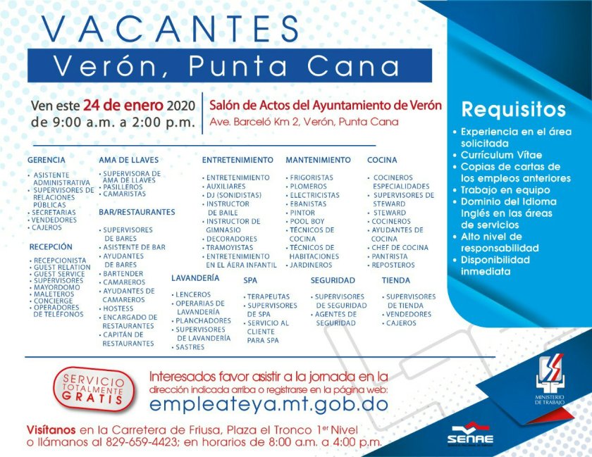 Santo Domingo.-El Ministerio de Trabajo, a través del Servicio Nacional de Empleo (SENAE), invita a las personas interesadas a participar en la jornada de Empleo que se realizará para una empresa de servicios este viernes 24 de enero, de 9:00 a.m. a 2: 00 p.m., en el Salón de Actos del Ayuntamiento de Verón, ubicada en la Ave. Barceló Km 2, Verón Punta Cana.