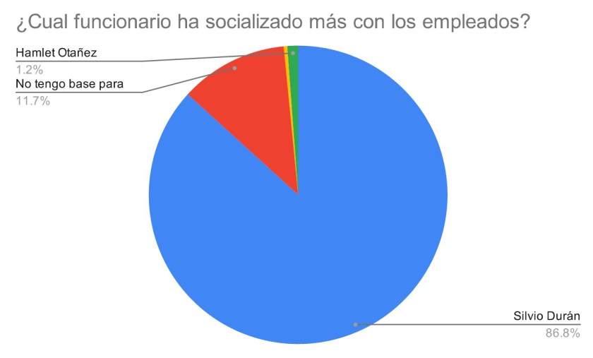 El director general de CORAASAN, también obtuvo un alto porcentaje cuando se preguntó, cual de los funcionarios ha socializado mas con los empleados? con lo que acumuló el 86.8%