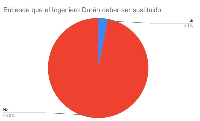 A la pregunta de que si el Ing. Durán, debe ser sustuído, el 96.9% dijo que no, contra 3.1 que dijo que sí, con lo cual confirman su aprobación al frente de esa empresa encargada de proporcionar el agua potable a todos los hogares de Santiago y la región.