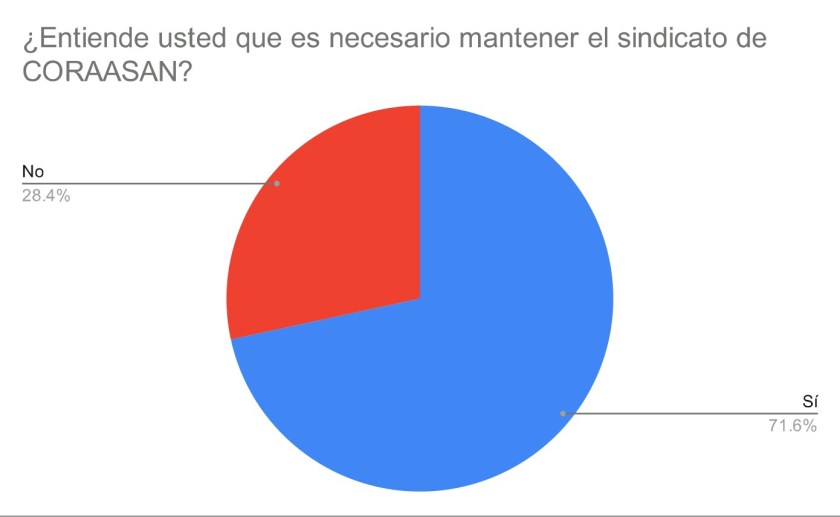 En el mismo cuestionario se le preguntó a los empleados, que si era necesario mantener el sindicato de Coraasan, a lo que el 71.6% contestó afirmativamente y el 28.4% respondió que no.