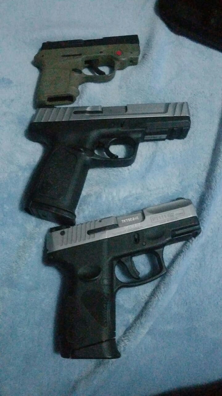En el interior del vehículo fueron ocupadas las pistolas Smith & Wesson, modelo SDA VE, calibre 9 milímetros, serie No. FYC9160; Taurus, modelo PT111 G-2, calibre 9 milímetros, No.TK80240 y Smith & Wesson, modelo Bodyguard, calibre 380, serie No. KEX5805, las cuales portaba de manera ilegal.
