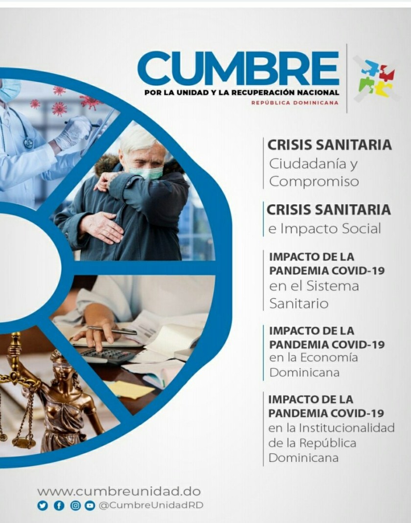 El Licenciado Lucildo Gómez Jiménez, en nombre del equipo coordinador, manifesto que la Cumbre por la Unidad y la Recuperación Nacional, tratará los temas: 1) Crisis Sanitaria, Ciudadanía y Compromiso, 2) Crisis Sanitaria e Impacto Social, 3) Impacto de la Pandemia COVID-19 en el sistema Sanitario, 4) Impacto de la Pandemia COVID-19 en la Economía Dominicana, 5) Impacto de la Pandemia COVID-19 en la Institucionalidad de la República Dominicana.