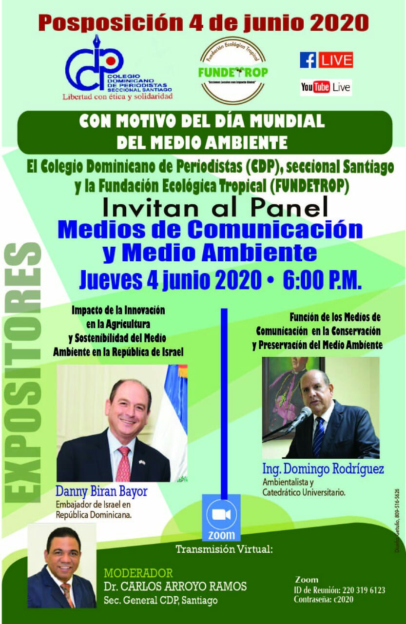 Santiago-Con motivo de la celebración del Día Mundial del Medio Ambiente, el Colegio Dominicano de Periodistas (CDP), seccional Santiago y la Fundación Ecológica Tropical (FUNDETROP) realizarán el Panel Medios de Comunicación y Medio Ambiente con el Embajador de Israel en el País, Danny Biran Bayor y el ecologista y comunicador Domingo Rodríguez.