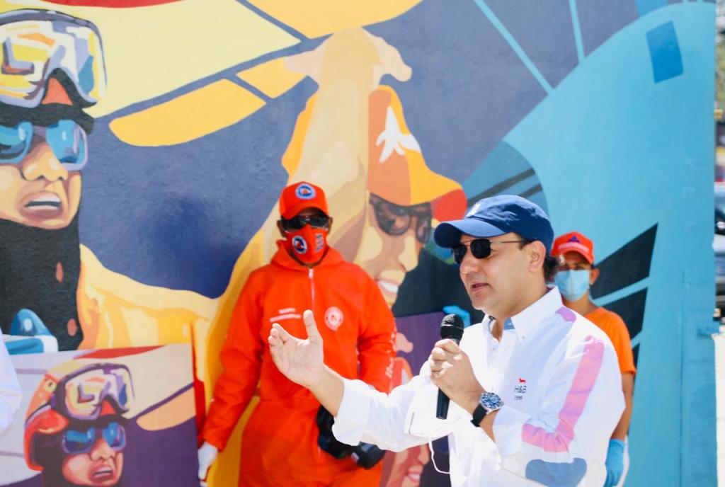 El impresionante mural, de la autoría de los artistas Khaterine Santana y Manaury Calasan, con la colaboración de Anilcia de Luna y Freddy Burgos, plasma las imágenes de médicos, enfermeras, bioanalistas, policías, bomberos, militares, voluntarios de la Defensa Civil, personal de limpieza municipal y otros héroes que han arriesgado sus vidas por salvar a la población.