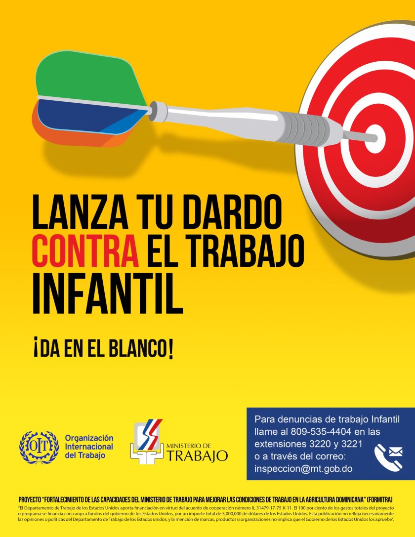 Santo Domingo.-El Ministerio de Trabajo con el Apoyo de la Organización Internacional de Trabajo (OIT), lanzó este miércoles la campaña de sensibilización “Lanza tu dardo contra el Trabajo Infantil”, actividad que se desarrolló a través de la plataforma virtual ZOOM.