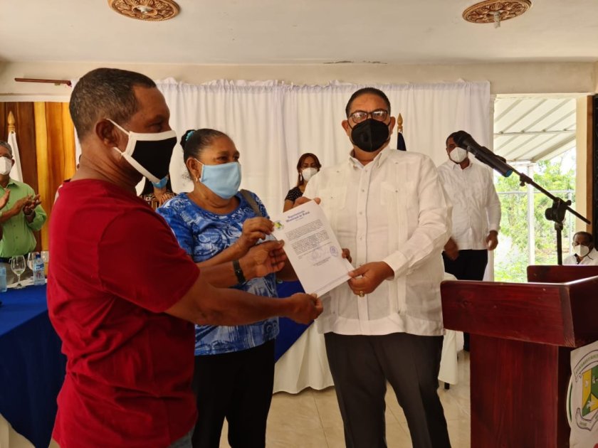 Romero entregó la documentación legal de la vivienda reparada a María Beato en medio de aplausos de la concurrencia.