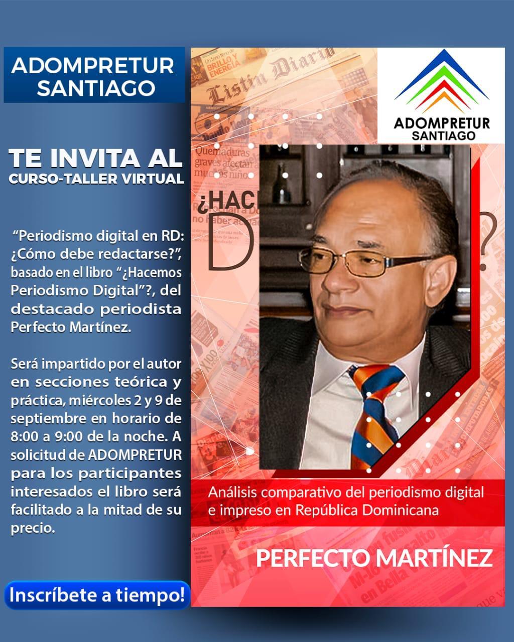 Santiago. La filial de Santiago de Asociación Dominicana de Prensa Turística (ADOMPRETUR) realizará este miércoles dos de septiembre su primer paso virtual de capacitacion con el curso-Taller “Periodismo Digital hoy en RD: ¿Cómo redactar en a Web?, impartido por periodista Perfecto Martínez, ¿autor del libro “Hacemos Periodismo Digital?: Análisis comparativo del periodismo digital y el impreso en República Dominicana.