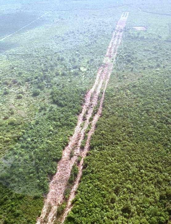 La ANA ha presentado unas fotografías aéreas que muestran una extensa devastación de la zona boscosa y que, por la forma de las trochas, hace presumir se trata de la futura pista de aterrizaje y área de parqueo de las aeronaves.