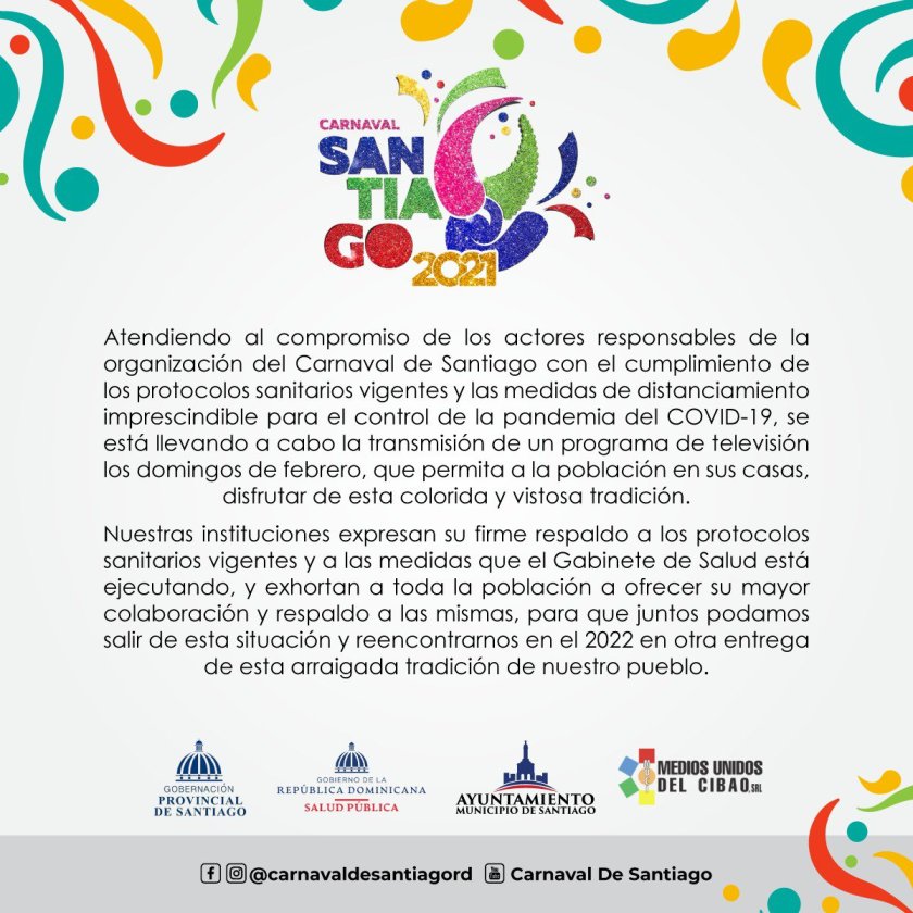 SANTIAGO. -Las instituciones que organizan el Carnaval de Santiago, la Gobernación Provincial, Ayuntamiento de Santiago y Medios Unidos del Cibao, motivaron a la población a cumplir con todas las medidas y protocolos sanitarios del Gabinete de Salud y disfrutar desde sus hogares de la propuesta televisiva, producida para esta temporada.