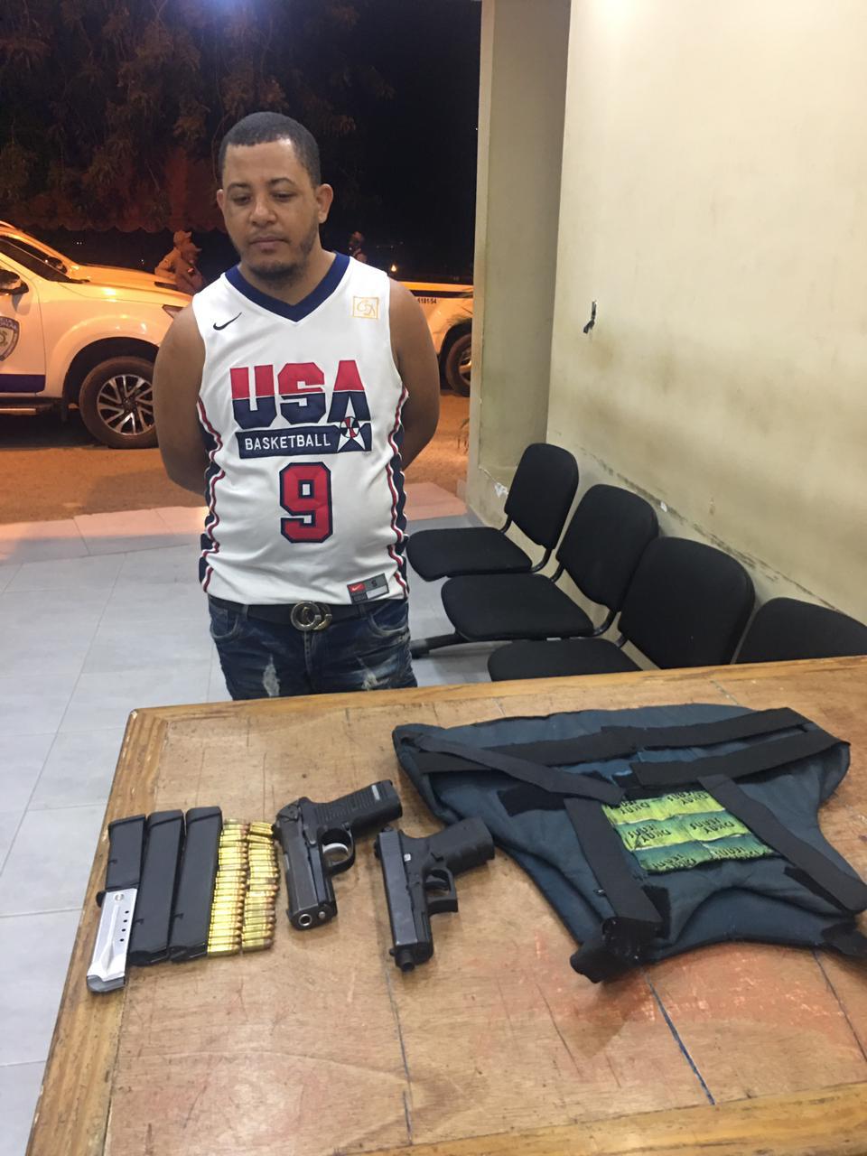 Santiago, Rep. Dom.- Nuestra Policía Nacional informó apresó a un hombre por ocuparle dos armas de fuego sin documentos, cuatro cargadores para pistolas y un chaleco antibalas, tras retener un vehículo durante una intervención realizada en horario de toque de queda, en el sector Monte Adentro, Licey al Medio de esta provincia.