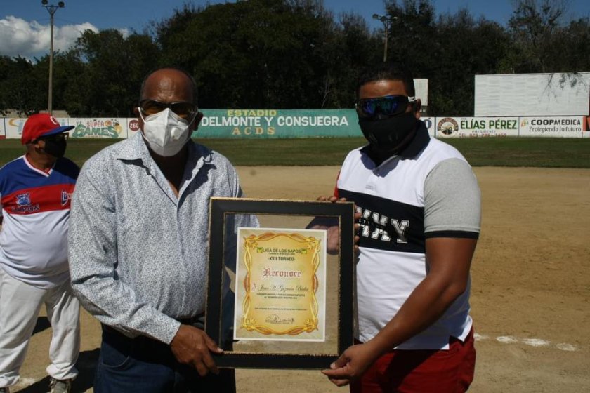 Llegó el.momento de los reconocimientos el primero a Alejandro Camacho entregado por Abel Rodriguez y Osvaldo Arzola de la Asoc. de Softbol de Santiago.