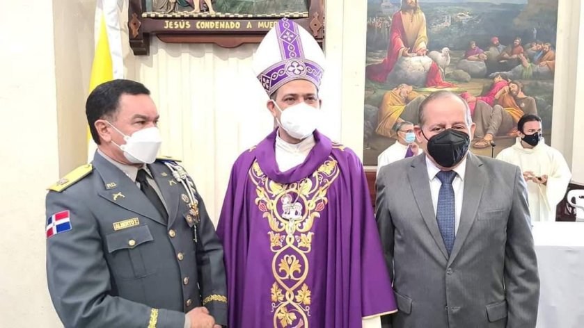 Santiago.- El empresario Emilio Reyes, asesor honorífico del presidente Luís Abinader acompañó al director Regional Cibao Central Policía Nacional con asiento en esta ciudad en la misa del 85 aniversario de la institución del orden.