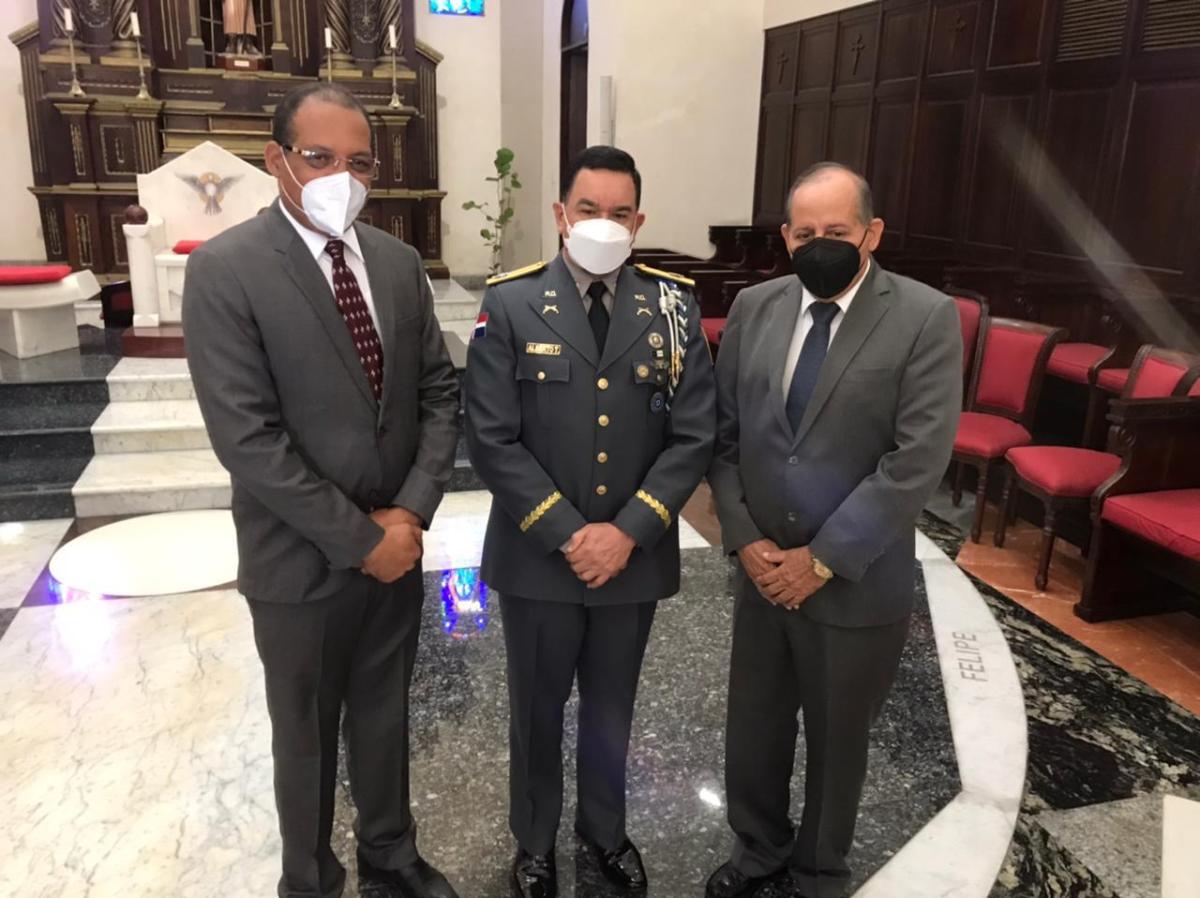 Santiago.- El empresario Emilio Reyes, asesor honorífico del presidente Luís Abinader acompañó al director Regional Cibao Central Policía Nacional con asiento en esta ciudad en la misa del 85 aniversario de la institución del orden.