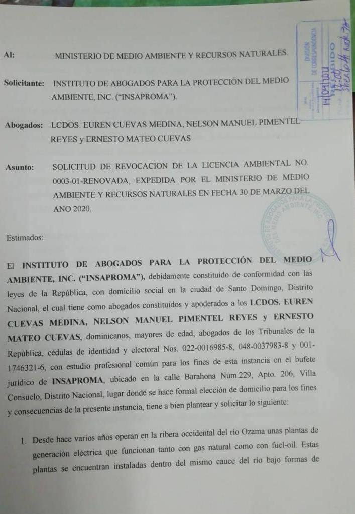El documento recuerda la suspensión, en marzo de 2017, de la licencia y el requerimiento de reubicación de la planta fuera del Ozama por su peligro térmico ambiental, ya que la barcaza capta para sus operaciones agua del río y luego la vierte a una temperatura más alta, lo que supone una alteración al recurso hídrico. Sin embargo, las posteriores renovaciones de la licencia suspendida, incluso en plena pandemia de Covid-19, y la posibilidad de concesión definitiva por la Superintendencia de Electricidad, alertan a los demandantes que estas operaciones entran en contradicción “con los esfuerzos del Estado para su recuperación ambiental”.