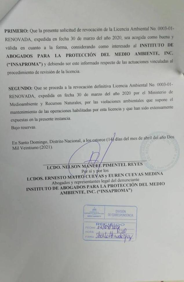 Por último, el requerimiento de INSAPROMA a Medio Ambiente para que revoque de forma definitiva la licencia a la planta eléctrica recuerda las diversas normativas que ha instado el Estado para la recuperación ambiental del río Ozama. Así, menciona la prohibición de descarga de residuos líquidos en el cauce fluvial, las actividades y operaciones de desguace de embarcaciones y la declaración de alta prioridad nacional de la rehabilitación, saneamiento, preservación y uso sostenible del río, “algo totalmente inconcebible manteniendo operaciones como las que por la presente instancia se denuncian”, aseguran.