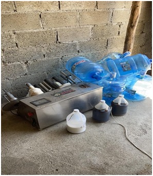 En el lugar ocuparon una máquina estampadora, un taladro, para licuar, 38 botellones de agua, tres galones de colorante, dos galones de cola blanca, dos tanques azul, dos garrafones y un rollo de etiqueta, además fue apresada una persona quien está siendo investigada.
