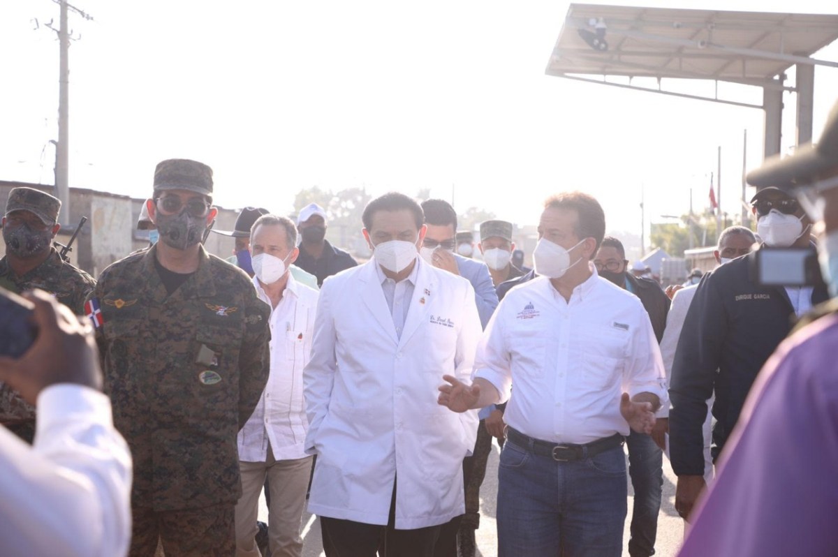 Dajabón.- Los titulares de los ministerios de Industria, Comercio y Mipymes, Salud Pública y Defensa, Víctor –Ito- Bisonó, Daniel Rivera y el Teniente General Carlos Luciano Díaz Morfa, respectivamente, visitaron este viernes el mercado binacional, con el objetivo de supervisar y dejar reforzados los protocolos de bioseguridad contra el covid-19 en esa línea de intercambio comercial.
