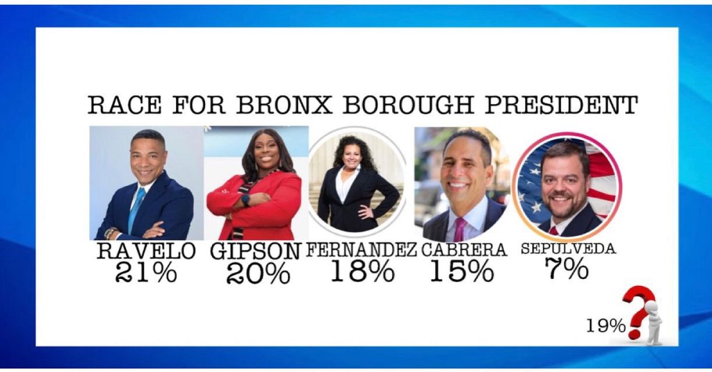 Ravelo, un ex teniente del Departamento de la Policía de Nueva York, encabeza con un 21% a la concejal Vanessa Gibson, quien tiene un 20%; rodeado de la asambleísta estatal, Nathalia Fernández con un 18%; el concejal Fernando Cabrera, con un 15%, el senador estatal Luis Sepulveda con un 7% y el restaurante 19% de los encuestados todavía no han decidido por quien ejercer el sufragio.