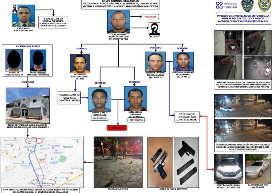 Este caso en específico fue dirigido por el reconocido delincuente José Alberto Ygnacio Santiago (a) Aneudy el Peje (prófugo); y los apresados Cristopher Eugenio Acevedo Metz (a) La Rabia; Roberto Antonio Cabrera Vargas (a) Aguja; Ramón Alberto Reyes Alejo (a) El Tollo; Alexander González Gómez (a) Titi, y Estil Diorys Fernández (a) El Mello, todos mayores de edad.