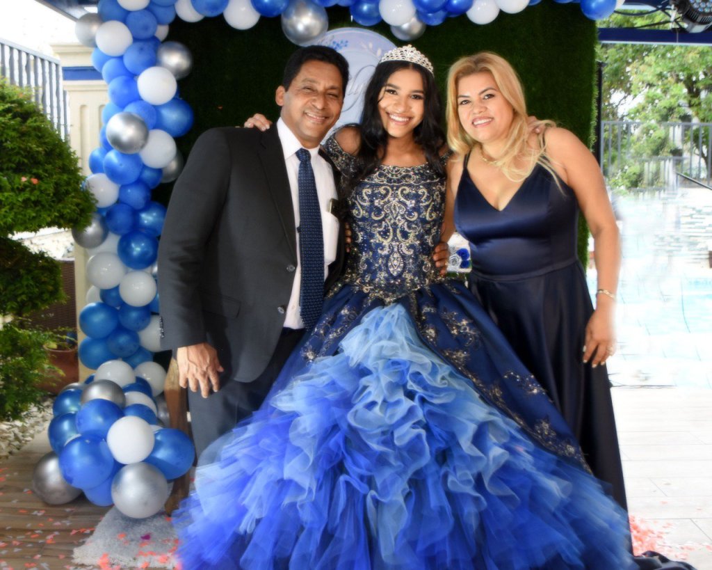 Los padres de la quinceañera visiblemente emocionados al recibir en su residencia todos los visitantes para celebrar juntos el cumpleaños de su princesa amada.