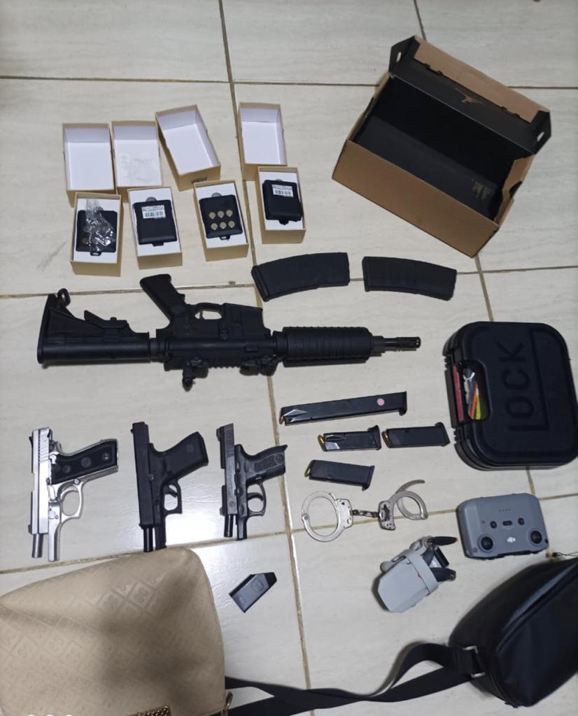 Luego, mediante orden de allanamiento en su residencia ubicada en el municipio de Tamboril, Santiago, en compañía de representantes del Ministerio Público, fueron ocupados un fusil con dos cargadores de 30 cápsulas, cuatro GPS portátiles, tres pistolas con su cargador y 22 cápsulas, un cargador adicional con 30 cápsulas, un par de esposas, tres celulares de distintas marcas y un dron.