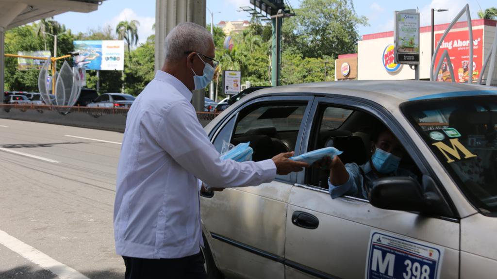 Santiago. – El director provincial del Instituto de Desarrollo y Crédito Cooperativo, (IDECOOP), Ángel María Pratt, organizó un operativo de entrega de mascarillas y gel desinfectante a choferes, pasajeros y transeúntes de las intercepciones de las avenidas 27 de Febrero, Juan Pablo Duarte y Estrella Sadhalá, con el objetivo de contribuir a la lucha para evitar contagios del Covid -19, al tiempo que hizo un llamado a la población a vacunarse.