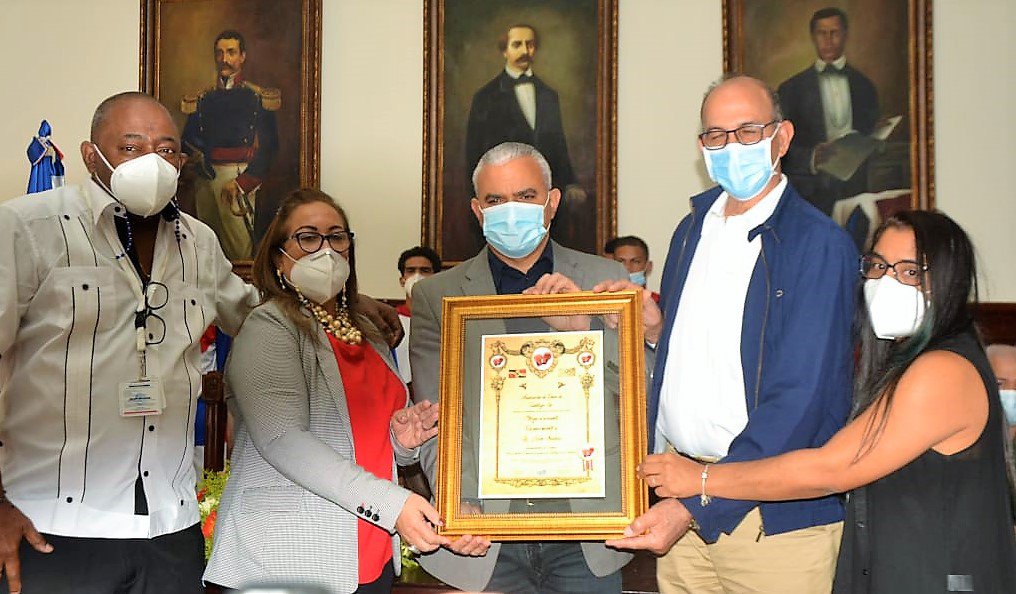 El licenciado Juan Madera, recibió el premio especial a La Excelencia, que le entregaron, la gobernadora licenciada Rosa Santos, el director general de CORAASAN, ingeniero Andrés Burgos, Anny Pérez y Ariel Acosta.
