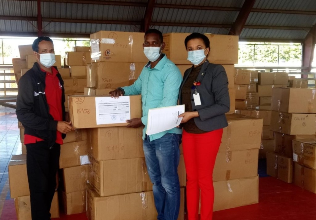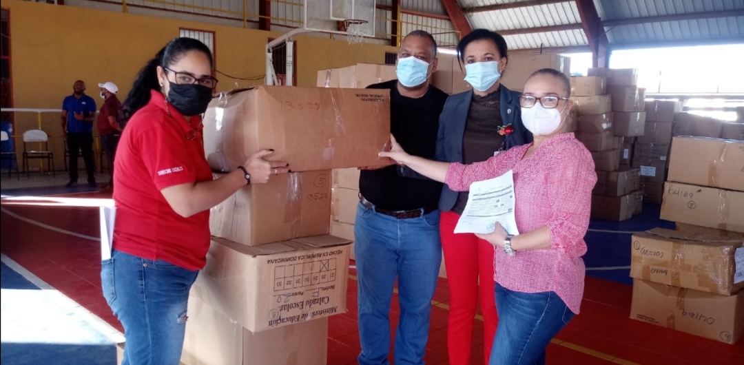 La directora del Distrito Educativo 08-07 de Navarrete, Jacqueline Mercado y el técnico distrital de INABIE, José Antonio Disla recibieron de la Comisión, las cajas que contienen pantalones, zapatos, camisetas y medias para estudiantes del nivel primario.