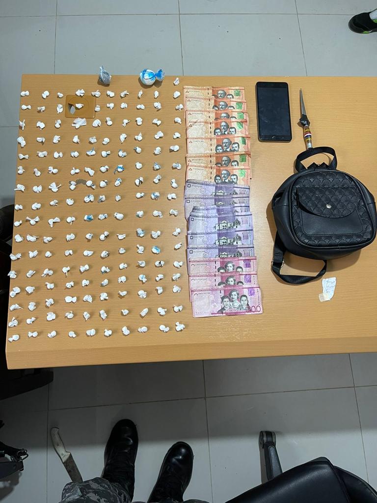 Además se les ocupó la suma de mil seiscientos pesos en efectivo, un teléfono celular, un arma blanca, (tipo cuchillo) y la referida motocicleta, por lo que en las próximas horas serán enviados a la Dirección Nacional de Control de Drogas (DNCD) para los fines procedentes.