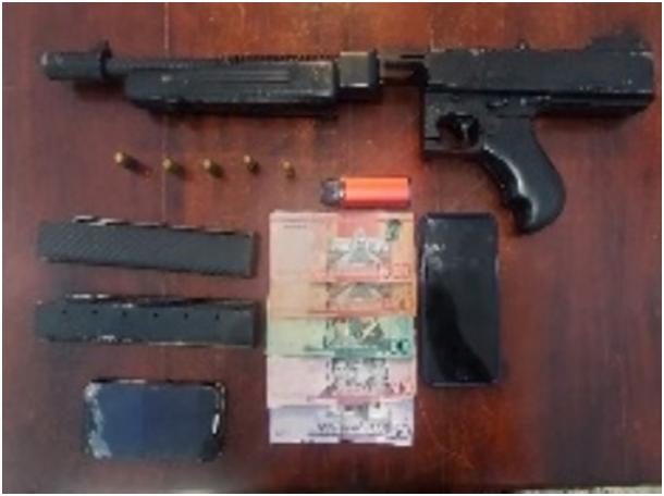 Los investigadores policiales procesan a los detenidos, así como se depura el arma, modelo EF-1928, color negro, serie S-62200, con dos cargadores y cinco cápsulas calibres 45, a fin de establecer responsabilidades penales.
