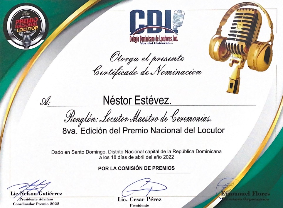 Estévez recibió su certificación como nominado en la categoría «Locutor Maestría de Ceremonias», de manos de los locutores: Miguel Ángel Gutiérrez, director de Prensa; Luis Ney Romero, productor y expresidente, y Justo Liriano, vicepresidente del CDL.