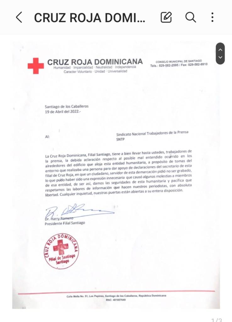 El presidente de la Cruz Roja Dominicana, filial Santiago, doctor Harry Romero, emitió un comunicado de prensa para aclarar el posible mal entendido ocurrido en los alrededores que aloja esa entidad humanitaria.