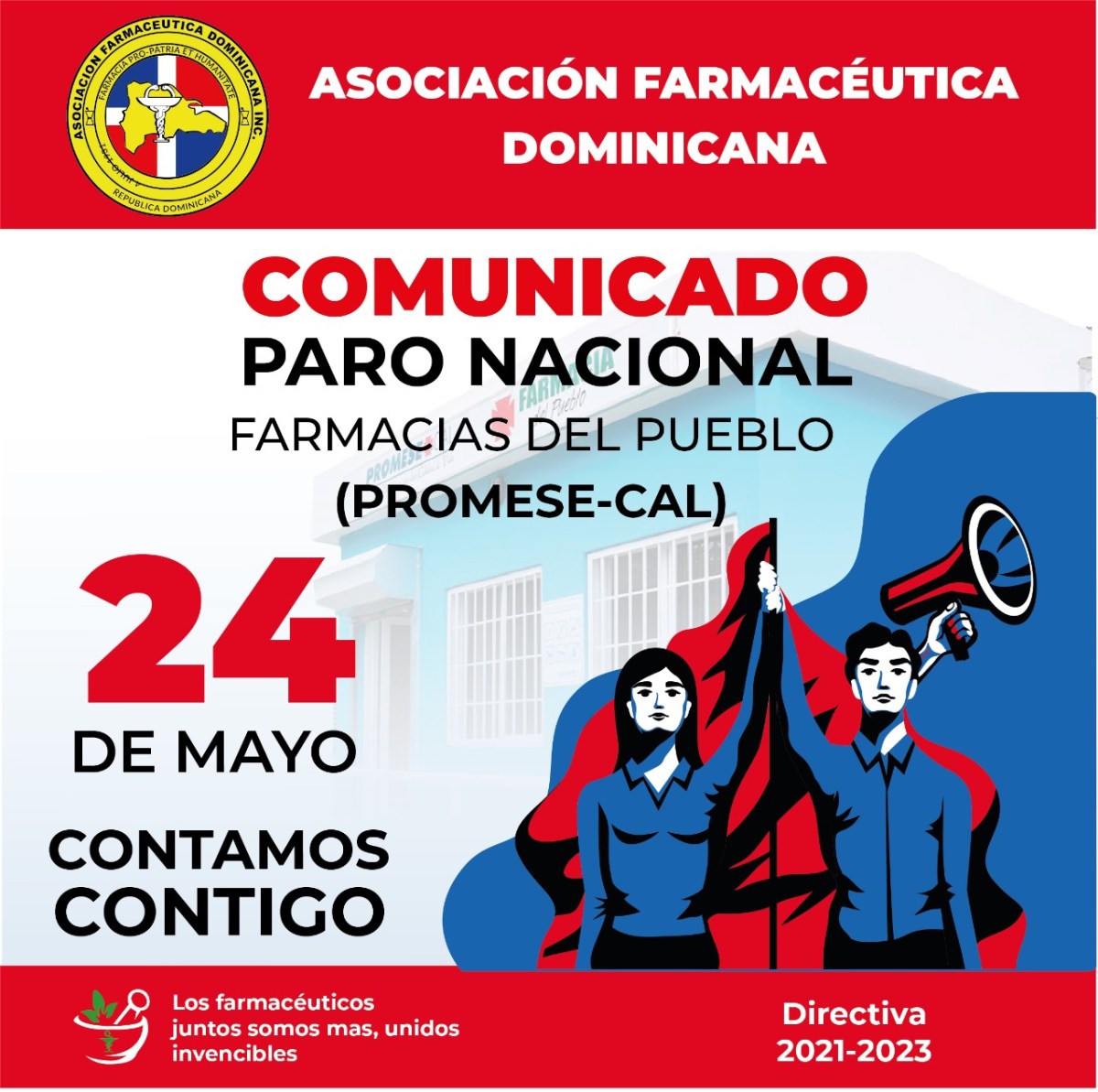 La Asociación de Farmacéuticas Dominicana (AFD), está convocando a un paro de labores escalonado que iniciará este martes 24, en procura de que el gobierno satisfaga un pliego de demandas que por años han venido haciendo.