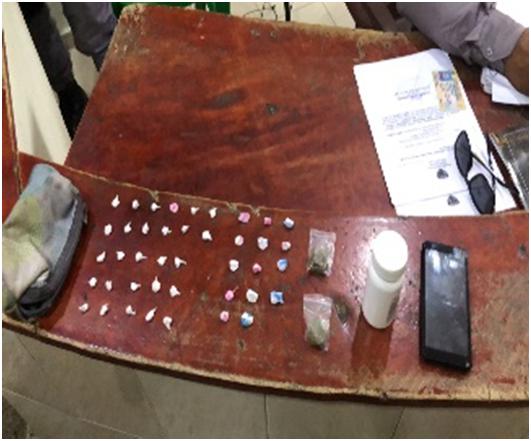 El material ocupado estaba dividido en 43 porciones de presunto crack, 15 porciones de un polvo blanco que se cree es cocaína y dos porciones de un vegetal verde, presumiblemente marihuana, envueltas en pedazos de fundas plásticas, además se le ocupo un teléfono celular.