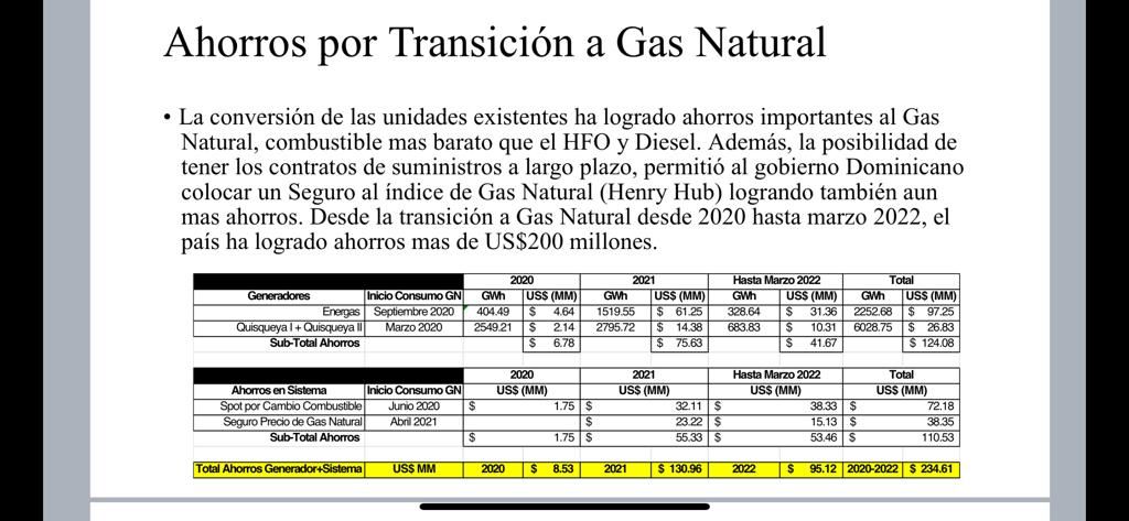 “La conversión de las unidades que posee la empresa ENERGAS, así como Quisqueya I y Quisqueya II, ha permitido no solo entregar más energía, sino también reducir el subsidio al sector eléctrico por parte del Estado, ya que producir con gas natural es más económico y abarata los costos a las generadoras, a las distribuidoras y por lo tanto a los usuarios. Por eso, desde la transición a gas natural desde marzo del año 2020 hasta marzo 2022, el país ha logrado ahorros por unos 234.61 millones de dólares”, manifestó.