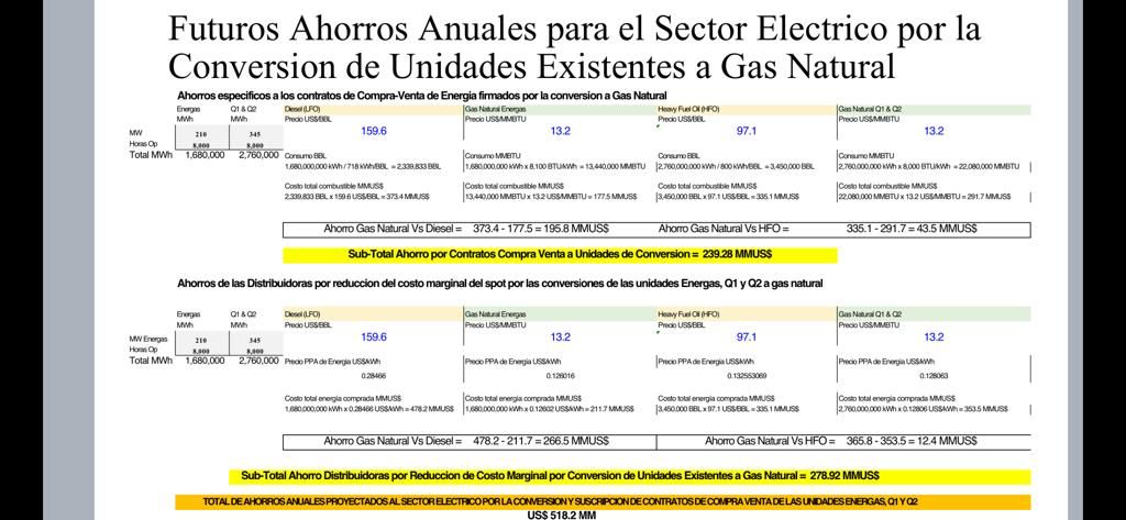 Explicó que esos US$518.2MM de ahorros anuales es debido al diferencial de precios de los combustibles hoy día, y precisó que eso es debido a la buena decisión de las pasadas y las actuales autoridades al hacer la conversión a gas natural y a cómo se continúa promoviendo el gas natural al ser un combustible limpio y con un precio más competitivo.