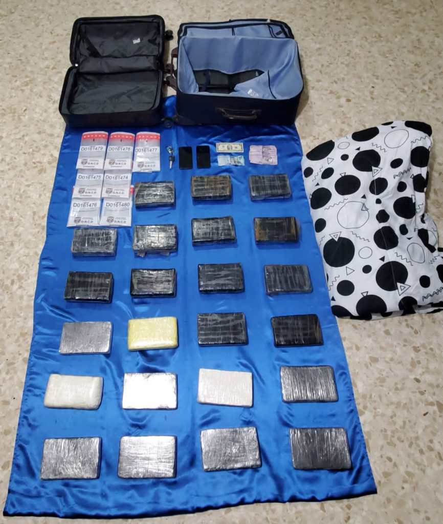 Al verificar los equipajes, en presencia de un fiscal adjunto, se ocupó en una de ellas 13 paquetes y en la otra 10, para un total de 23 paquetes de la sustancia.