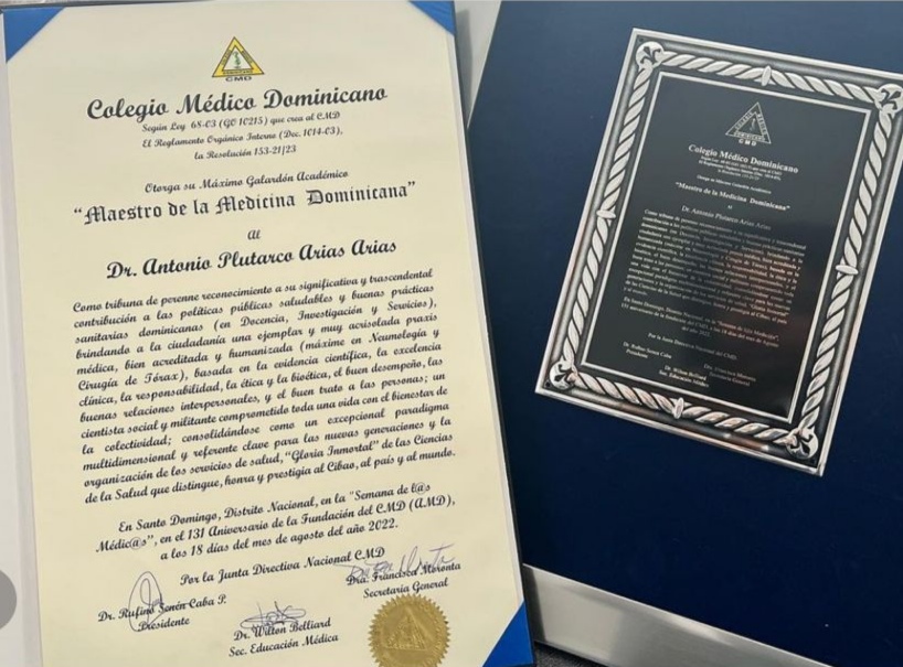 «Como tribuna de perenne reconocimiento a su significativo y trascendental contribución a las políticas públicas saludables y buenas prácticas sanitarias dominicanas (en docencia, investigación y servicios) brindando a la ciudadanía una ejemplar y muy acrisolada praxis médica, bien acreditada y humanizada, (máxime en neumología y cirugía de tórax) basada en la evidencia científica, la excelencia clínica, la responsabilidad, la ética y la bioética, el buen desempeño», reza el pergamino.