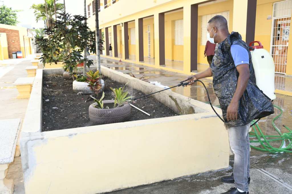 En todos los centros educativos de este distrito, con la colaboración de Salud Pública, se está fumigando, eliminando malezas y todos los focos de propagación de dengue, con miras a asegurar la inocuidad del ambiente escolar, observó el profesor Pedro Pablo Marte Gutiérrez.
