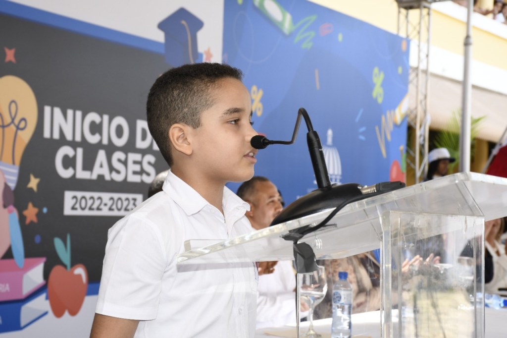 El estudiante Ethan Elías Raposo dio las gracias en nombre de los estudiantes del centro educativo San Francisco de Asís, por permitirles ser la escuela modelo para la apertura.